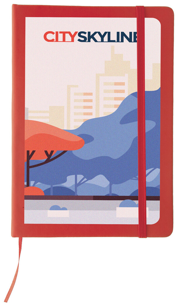 Poznámkový blok se 100 listy, záložkou a gumičkou.