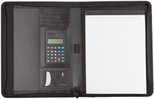 A4 sloha na dokumenty s deskami z PU kůže a plátna s kovovým štítkem, na zip s uchem a s 20 listým linkovaným blokem a solární kalkulačkou.