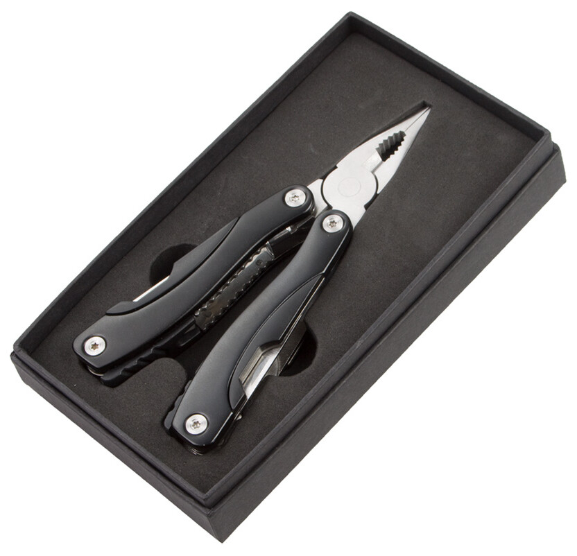 Nerezové multi kleště s hliníkovou rukojetí a 8mi funkcemi. V černé dárkové krabičce.