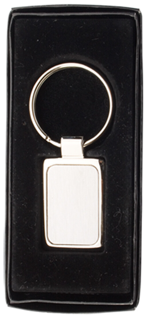 Kovový přívěšek na klíče v krabičce z černého kartonu.