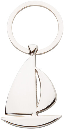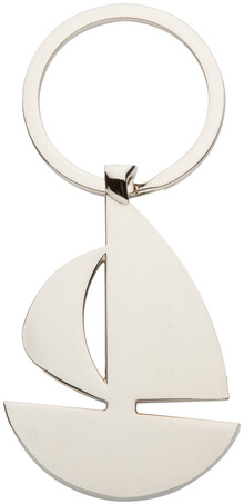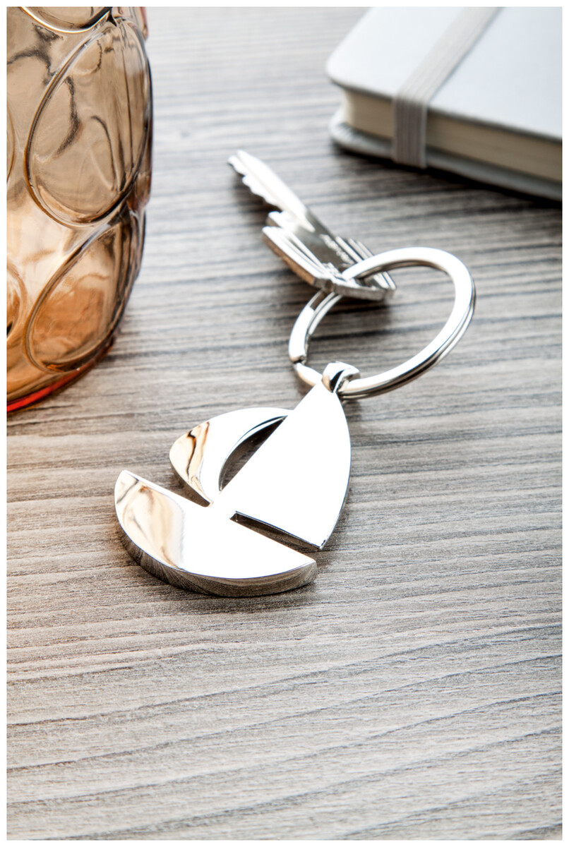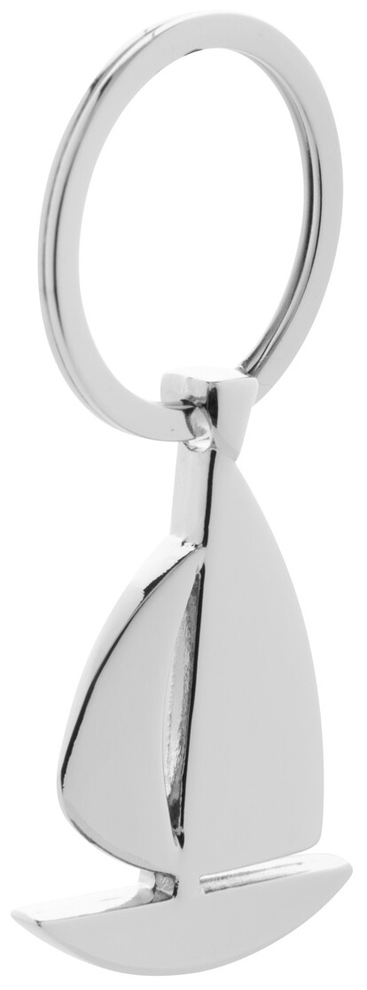Kovový přívěšek na klíče ve tvaru plachetnice v krabičce z černého kartonu.