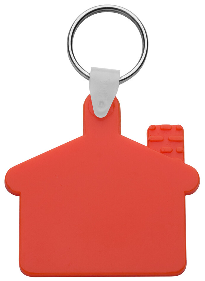 Plastový přívěšek ve tvaru domečku s kovovým kroužkem.