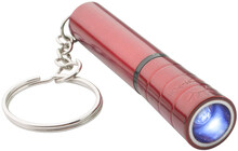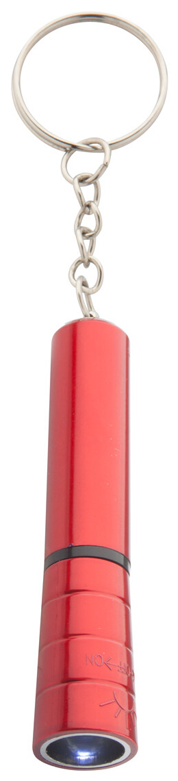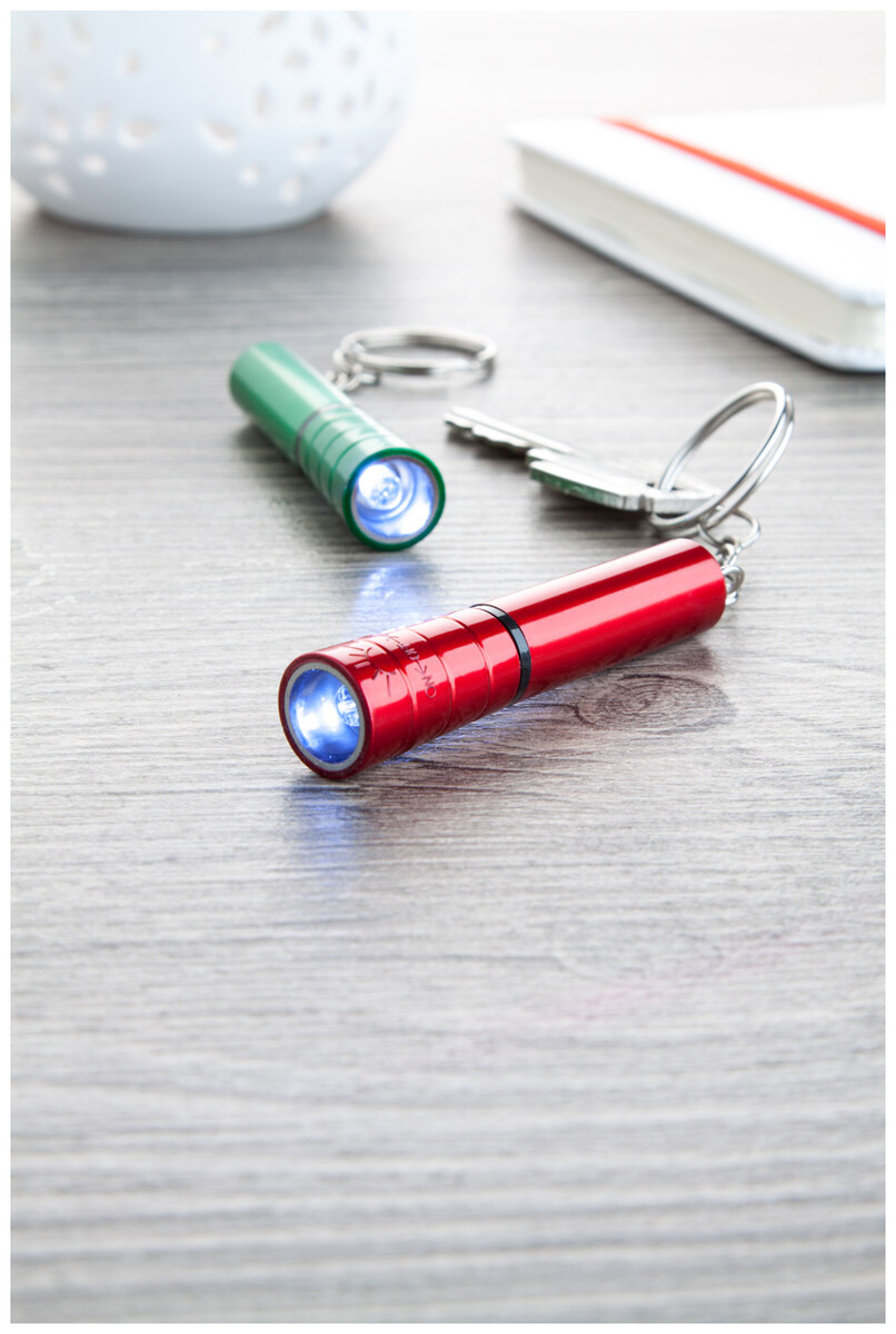 Plastová mini baterka s 1 LED, kovovým povrchem a kovovým kroužkem na klíče. S knoflíkovou baterií.