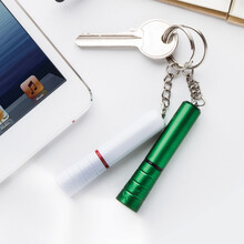 Plastová mini baterka s 1 LED, kovovým povrchem a kovovým kroužkem na klíče. S knoflíkovou baterií.