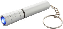 Plastová mini baterka s 1 LED, kovovým povrchem a kovovým kroužkem na klíče. S knoflíkovou baterií.