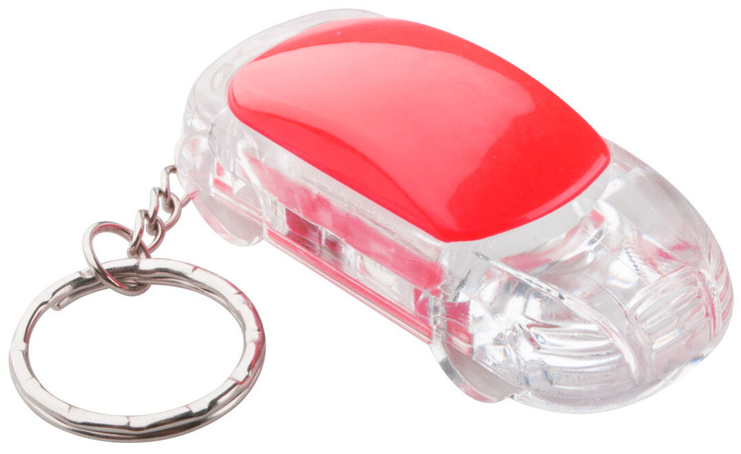 Plastový přívěšek na klíče ve tvaru auta s 1 LED diodou a kovovým kroužkem, vč. knoflíkové baterie.
