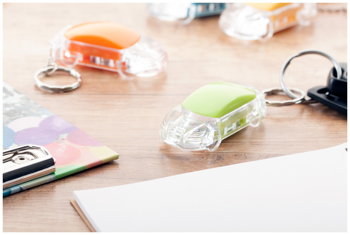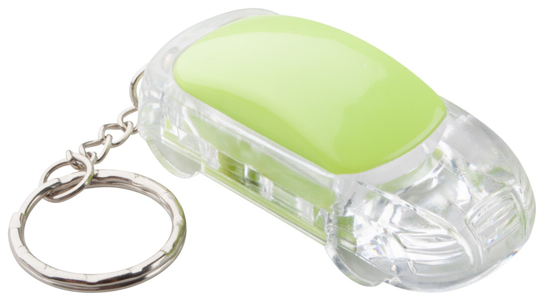 Plastový přívěšek na klíče ve tvaru auta s 1 LED diodou a kovovým kroužkem, vč. knoflíkové baterie.