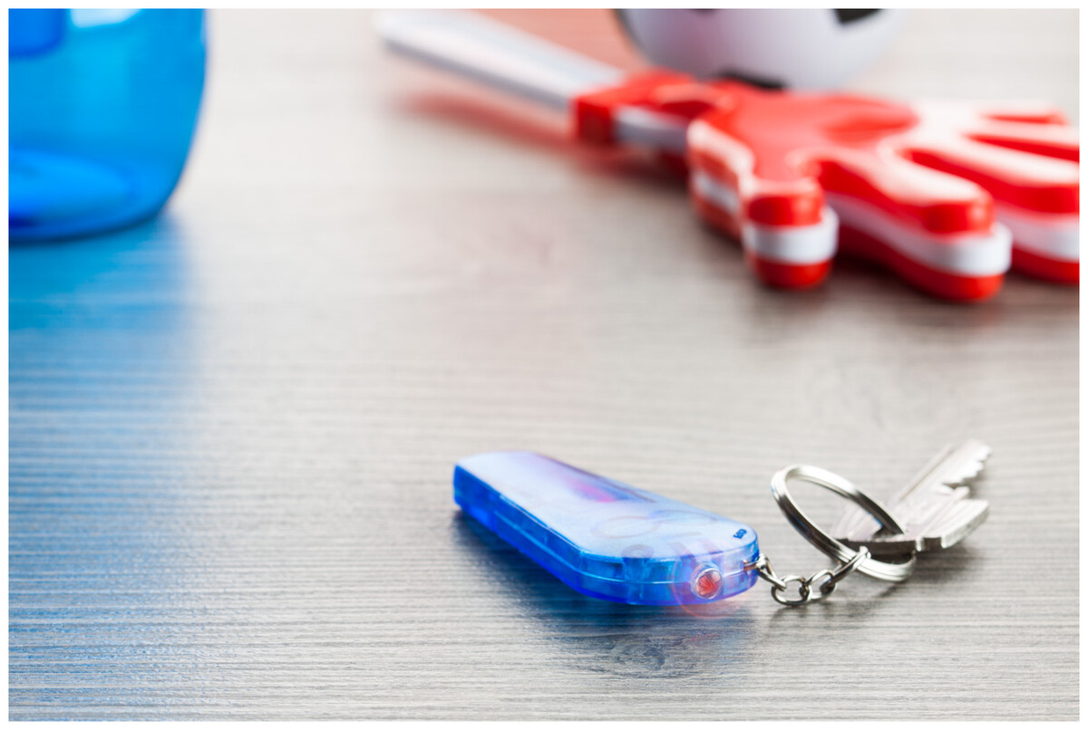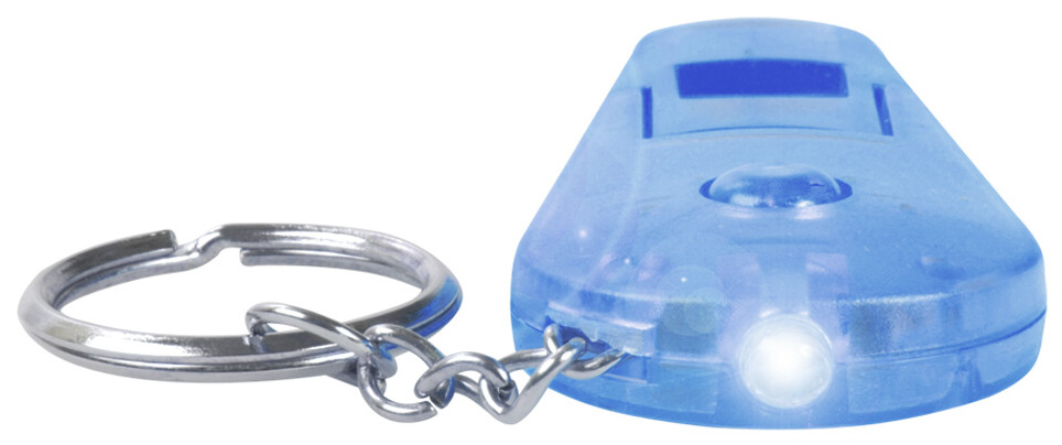 Transparentní plastová píšťalka s kroužkem na klíče se svítilnou, vč. baterií.