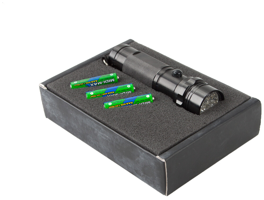 Hliníková baterka se 14ti LED diodami v černé dárkové krabičce. Dodáváno s 3 AAA bateriemi.