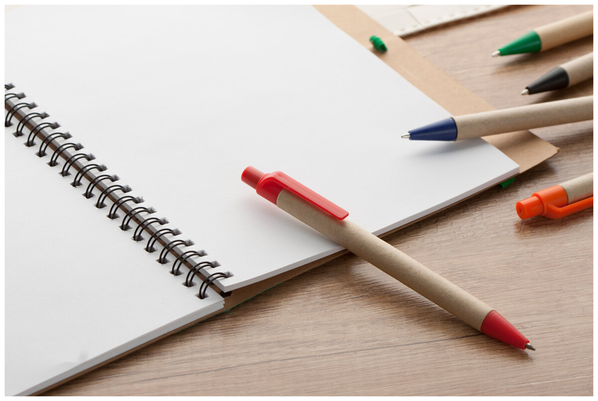 Recyklovatelné papírové kuličkové pero s modrou náplní.