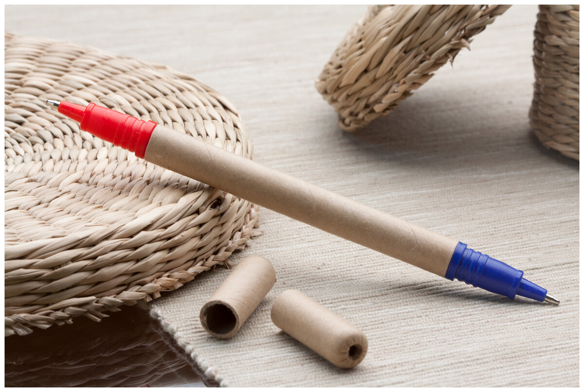Oboustranné kuličkové pero z recyklovaného papíru a s červenou a modrou náplní.