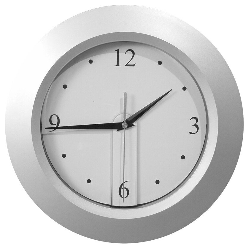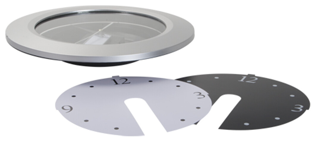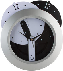 Plastové nástěnné kulaté hodiny, 2 vyměnitelné ciferníky (bílý a černý), bez baterií. Možnost návrhu vlastního ciferníku s digitálním potiskem na vyžádání.