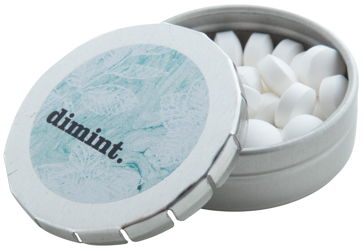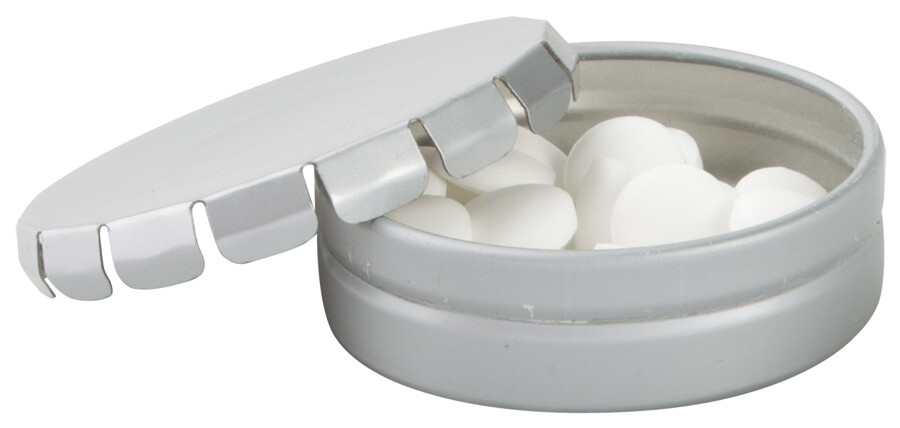 Kulatá, kovová krabička s cca. 12 gramů mentolových bonbonů. Lze otevřít stisknutím víčka.