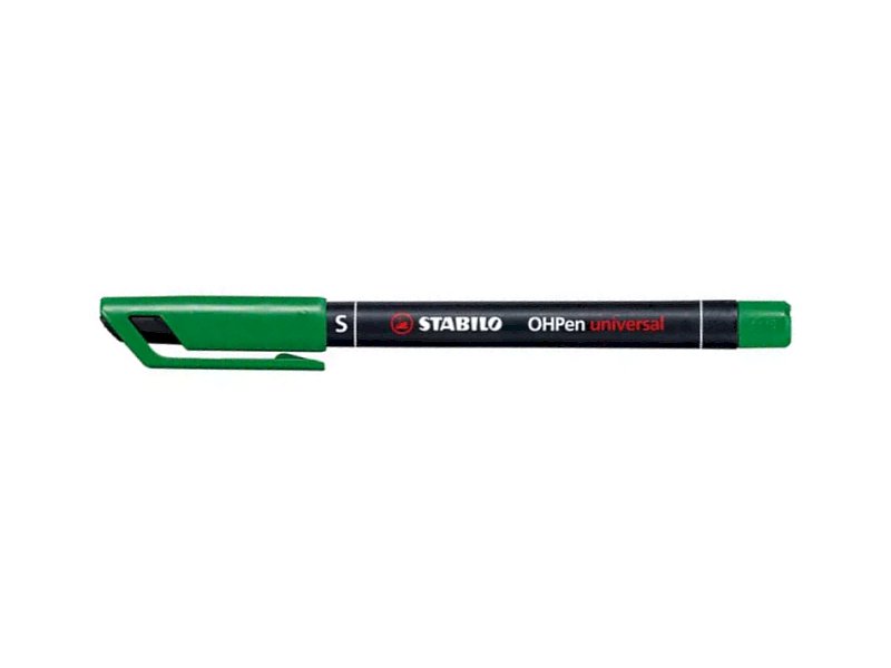 Potřebujete dát svoje myšlenky na papír nebo je prezentovat ostatním? STABILO OHPen Universal S popisovač píše téměř na všechny hladké povrchy. Černé tělo popisovače značí permanentní inkoust zelené barvy. Šíře stopy 0,4 mm. Neklouzavá zóna zaručuje pohodlný úchop a díky praktickému klipu se nebude nikam kutálet. Ochrana proti vysychání, vydrží až 72 hodin bez víčka. Na konec pera lze připevnit víčko.
