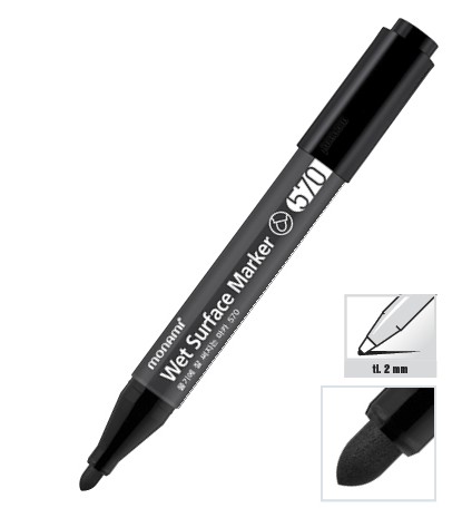 Popisovač permanentní pro vlhké/mokré povrchy, dobře drží na savých i nesavých površích, kulatý hrot 2 mm, kulaté tělo, inkoust dokáže odpudit vodu a přilnout k povrchu pod ní. Určeno pro zmrazené povrchny, mrazírny, venkovní použití atd..
