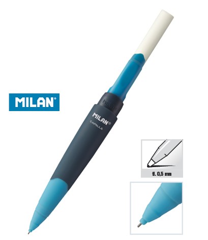 Mikrotužka s pogumovaným tělem umožňuje příjemný úchop. Má velice moderní design, EXTRA velkou pryž MILAN. Dodáváno s tuhou tvrdosti HB, šíře 0,5 mm. Prodáváno v barevném mixu: modrá, fialová, černá, růžová a zelená.
