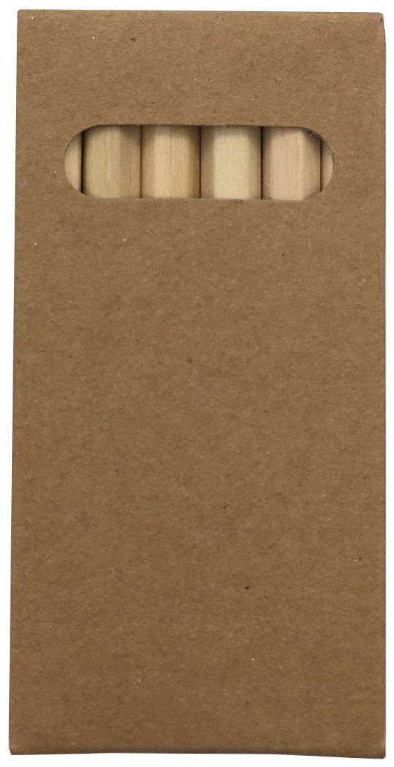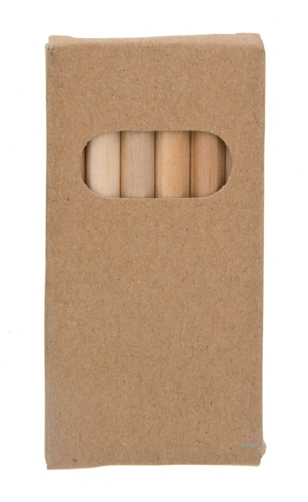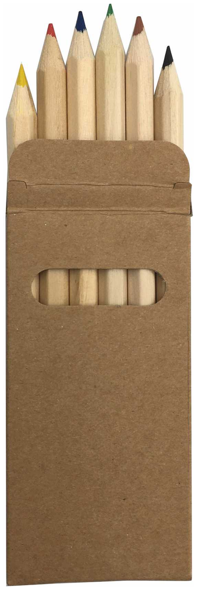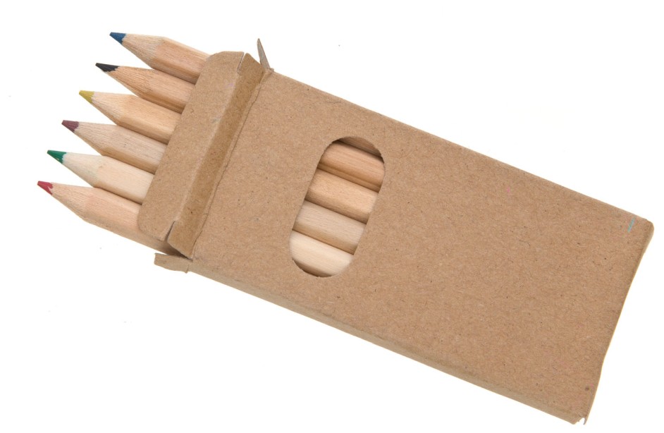 Přírodní, krátké, dřevěné, hrocené pastelky, 6 ks v papírovém obalu. Rozměr obalu 90 x 45 x 8 mm. Balení po 100 ks.
