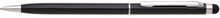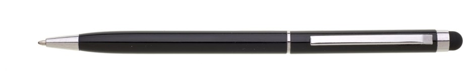 Tenká černá kovová propiska s otočným mechanismem a touch koncem. Stříbrné, chromové doplňky, náplně cross, modře píšící. Materiál hliník.