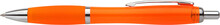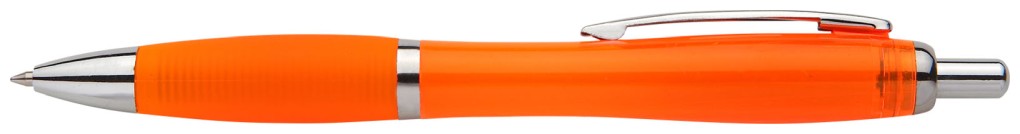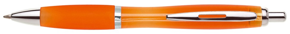 Oblíbené plastové propisovací pero ULTA s celobarevným, transparentním, oranžovým tělem. Barva pogumovaného úchopu je stejná jako tělo. Pero je zdobené stříbrným proužkem, ostatní doplňky jsou také stříbrné. Náplň je velkoobsahová, modře píšící.