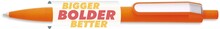 Plastová propiska ve výrazné oranžové neonové barvě. Stříbrná část je vsazena do části klipu a je vhodná pro potisk. Kolekce DESIGN. Náplň velkoobsahová, modře píšící.