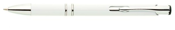Plastové propisovací pero OIRA - bílé. Pero je zdobené dvěma stříbrnými proužky. Na těle je zdobeno oválným výřezem. Pero má náplň velkoobsahovou, modře píšící.