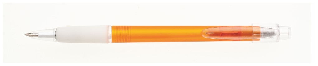 Kuličkové transparentní pero PROSTO. Má gumový úchop, tělo pera je oranžové. Klip a špička pera je průhledná.Náplň je X20, modře píšící.