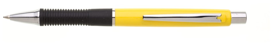 Kuličkové pero PRIOLA jasně žluté, má úchop z černého, pogumovaného vroubkovaného materiálu. Doplňky pera jsou ve stříbrné barvě.