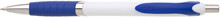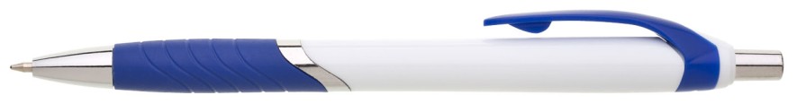 Plastová propiska s bílým tělem s modrým úchopem a klipem a stříbrnými doplňky.
