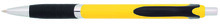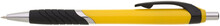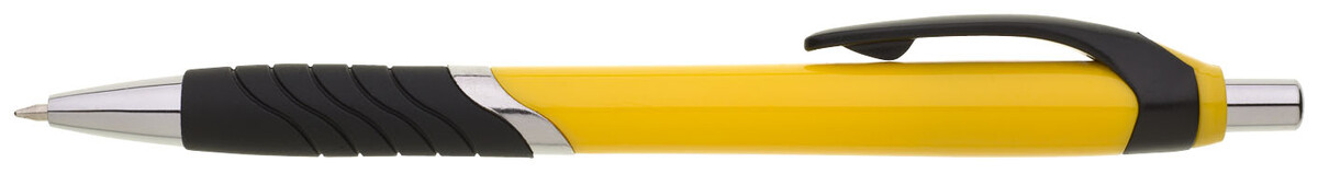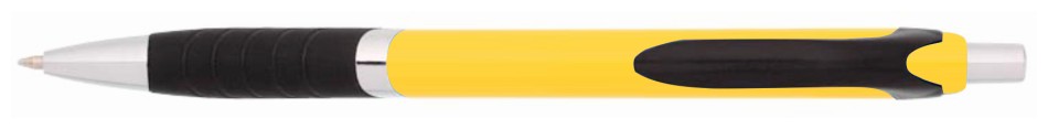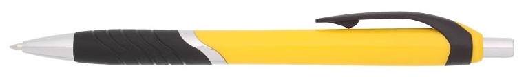 Plastové propisovací pero PEINA žluté. Pero má černý pogumovaný úchop s vroubky, zakončený stříbrným šikmým poružkem.Klip je včerné barvě. Náplň je X20 , píše modře.