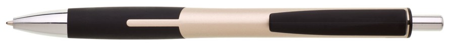 Plastová propiska CHANEL zlatá s černým, pogumovaným gripem a širokým plastovým, černým klipem vhodný pro potisk. Cvakátko a špička je pochromovaná. Náplň X20 -110 mm.
