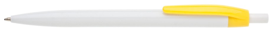 Plastové, kuličkové pero LIDO má bílé tělo a žlutý klip. Má náplň X-20 (106mm), modře píšící.