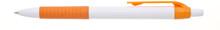 Propiska s bílým tělem, oranžovým gripem a klipem, náplň modře píšící.