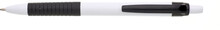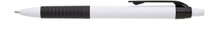 Propiska s bílým tělem, černým gripem a klipem, náplň modře píšící.