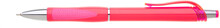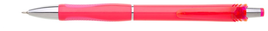Neonová růžová plastová propiska s transparentním klipem a stříbrnými doplňky. Náplň X20 s mikrohrotem 0,5 mm, semi gel, modře píšící.