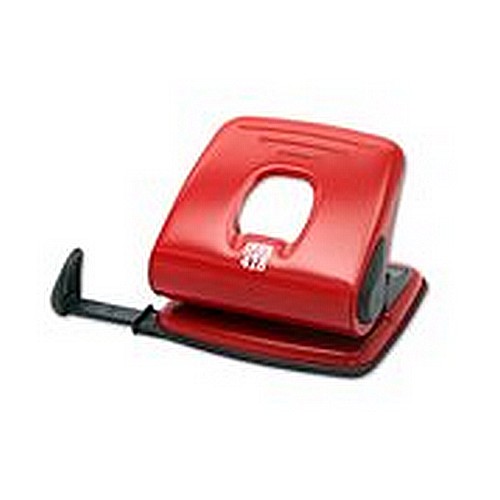 Stolní celokovový děrovač. Děrovač s kapacitou až 25 listů, průměr otvoru 5,5 mm, rozteč otvorů 80 mm. Plastový příložník. Barevné provedení: červené.