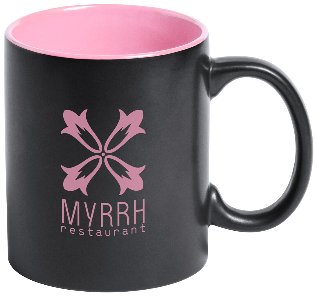 Černý keramický hrnek s barevným vnitřkem, 350 ml. Speciální povrch pro laser, kdy vygravírované logo má stejnou barvu jako vnitřek hrnku. V dárkové krabičce.