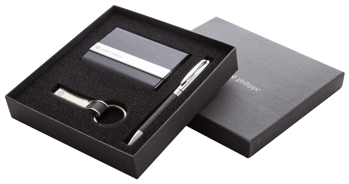 Elegantní set s kuličkovým perem s černou náplní, vizitkářem a klíčenkou. Materiál kov/PU kůže. Značkový produkt André Philippe.