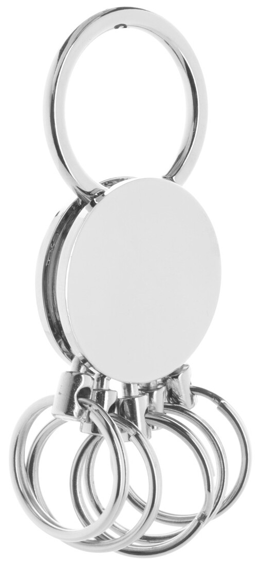 Kulatý kovový přívěšek na klíče s 5 odnímatelnými kroužky, v černé dárkové krabičce.