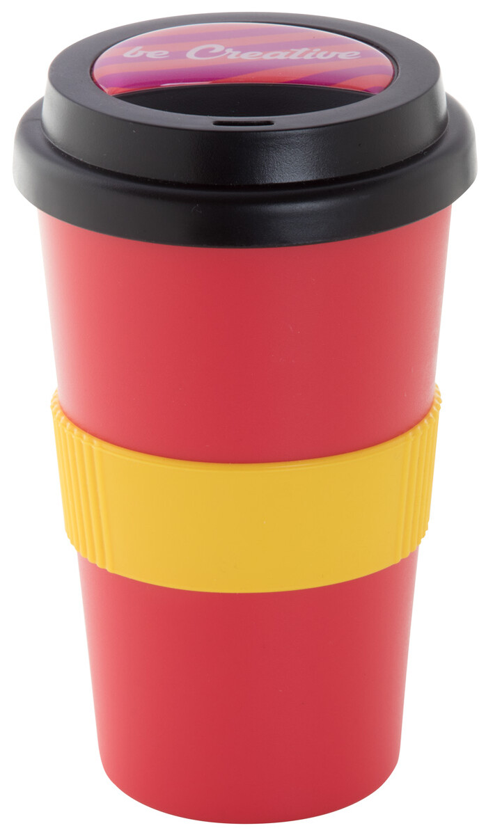 Dvoustěnný plastový termo hrnek s víčkem na pití a silikonovým úchopem na zakázku. 400 ml. Min. mn.: 50 ks.