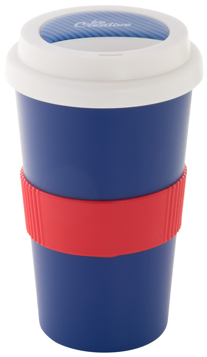 Dvoustěnný plastový termo hrnek s víčkem na pití a silikonovým úchopem na zakázku. 400 ml. Min. mn.: 50 ks.