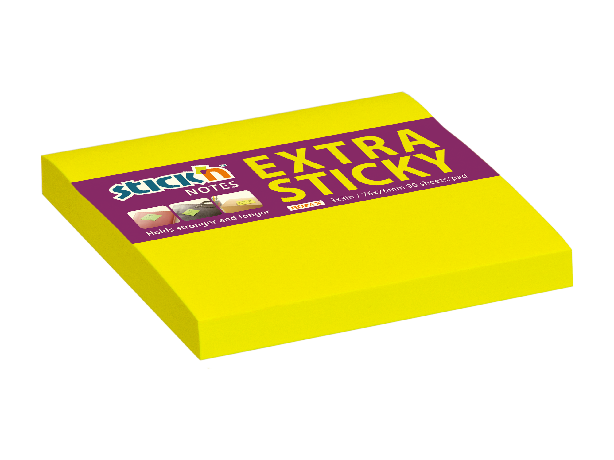 Samolepicí bloček Stick'n by Hopax EXTRA STICKY, 76 x 76 mm, neon žlutý, 90 lístků