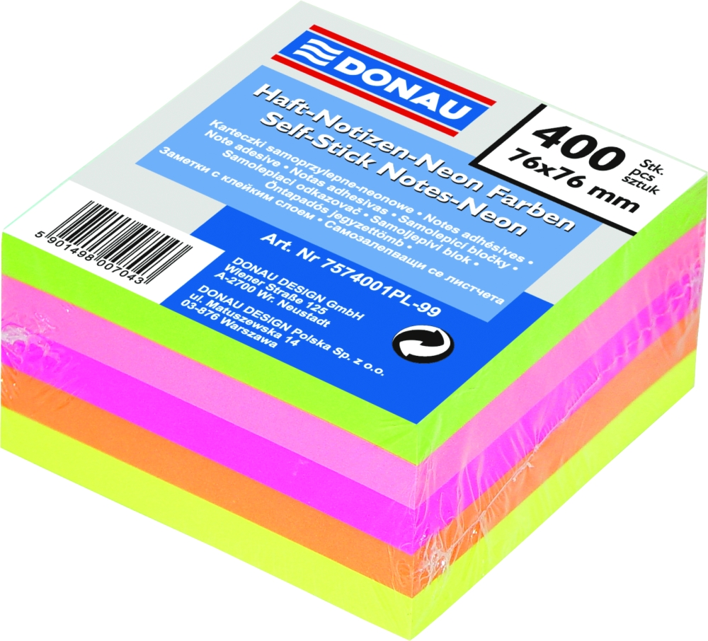 | U7574001PL-99 | BLOČEK SAMOLEPÍCÍ DONAU 76 x 76 mm, 400 listů, mix neonových barev | 100,38 Kč | 121,46 Kč | 1 ks | |||