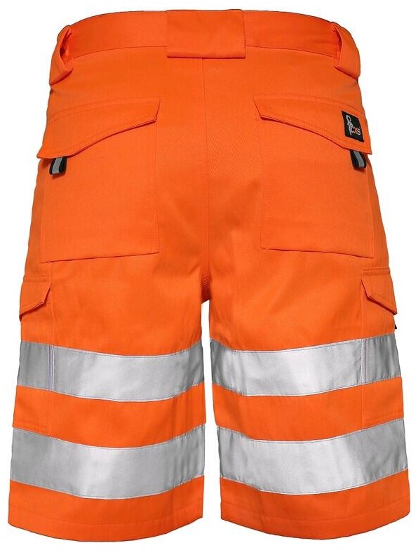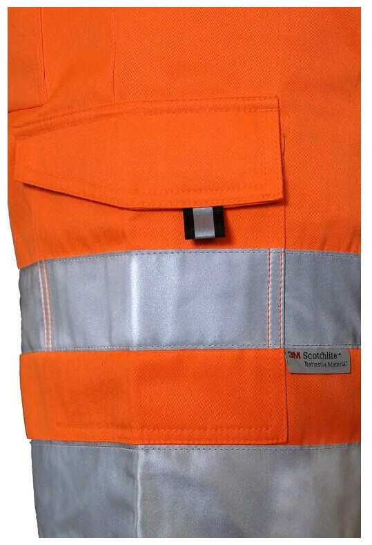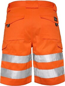 Pánské výstražné kraťasy, pas s poutky na opasek a gumou v bocích, přední klínové kapsy, zadní kapsy s klopou na suchý zip, boční kapsy s klopou na suchý zip, levá boční kapsa rozdělena na dvě komory, reflexní pruhy 3M.