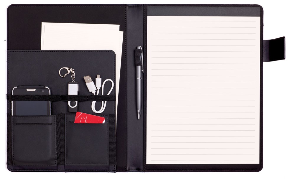 Černé designové portfolio (konferenční desky) s magnetickým zapínáním, včetně poznámkové knihy A4 (20 listů).