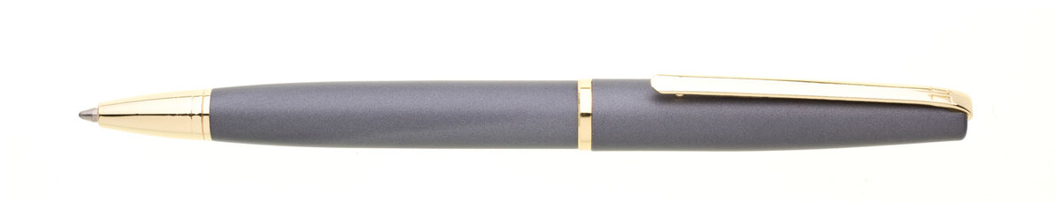 Elegantní šedá mosazná propiska s doplňky ve zlaté barvě. Laser zlato-šedý