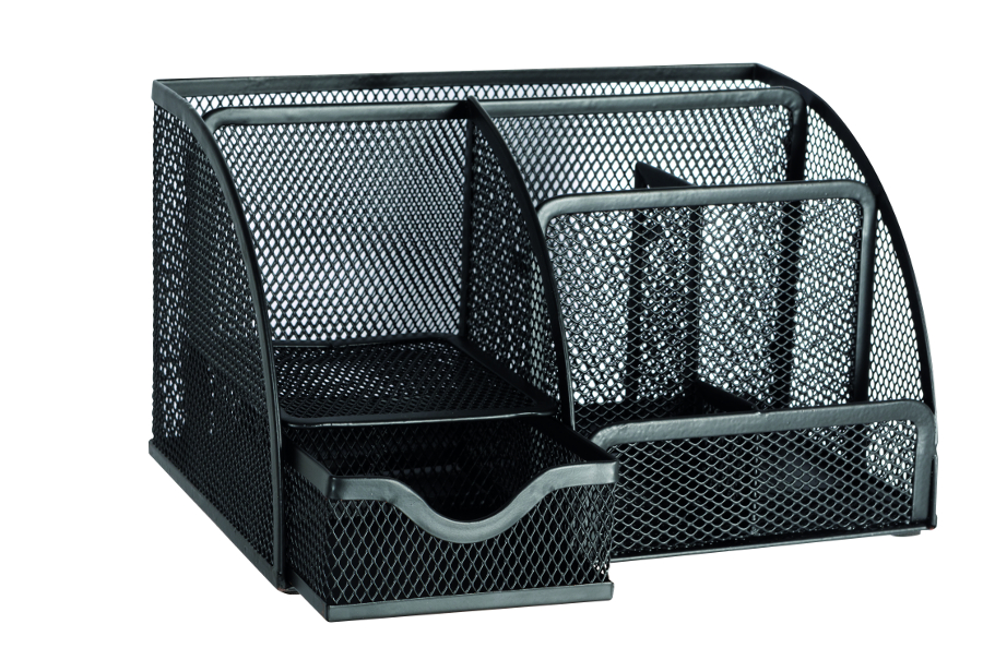 Kovový organizér na dopisy a psací potřeby, šířka 17,5 cm, výška 13,5 cm, hloubka 7,7 cm.