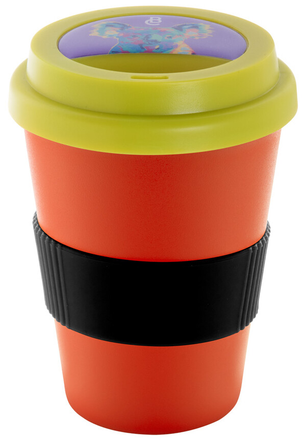 Dvoustěnný plastový termo hrnek s víčkem na pití a silikonovým úchopem na zakázku. 300 ml. Min. mn.: 50 ks.