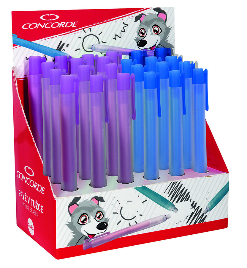 Pryž v tužce s klipem a posuvným mechanismem. Plastové tělo v mixu dvou barev. Průměr pryže 7 mm. Jednorázová.