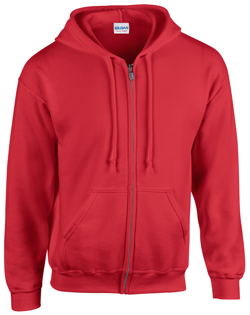 Mikina 50% bavlna / 50% polyester s kapucí, kovovým zipem a předními kapsami, 271 g/m2 (bílá 257 g/m2). Produkt značky Gildan.