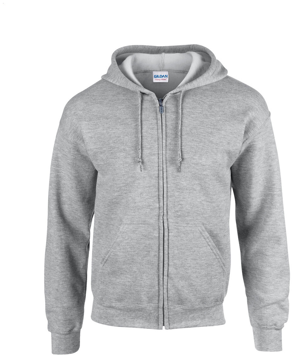 Mikina 50% bavlna / 50% polyester s kapucí, kovovým zipem a předními kapsami, 271 g/m2 (bílá 257 g/m2). Produkt značky Gildan.